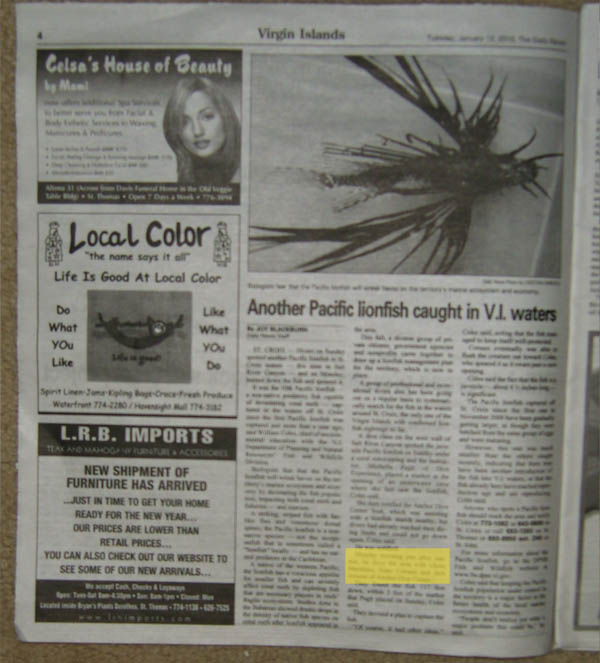 It was the 10th Pacific lionfish - a non-native predatory fish capable of devastating coral reefs - captured in the waters off St. Croix since the first Pacific lionfish was captured just more than a year ago, said William Coles, chief of environmental education with the V.I. Department of Planning and Natural Resources' Fish and Wildlife Division.